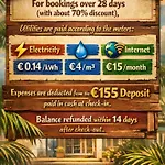 Acest apartament, are zonă de locuit, un balcon și o terasă, precum și conforturi precum aer conditionat. Pentru un plus de confort, această proprietate 1 baie este. În plus, există un uscător de păr și prosoape de baie.